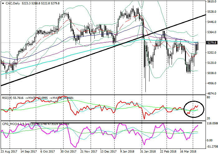 On the daily chart, the instrument is trading in the upper Bollinger band. The price remains on the level with the EMA65, EMA130 and SMA200 that are horizontal. The RSI is growing, having broken out its longer MA. The Composite is about to test its strong resistance.