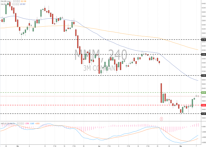 Last week, the issuer kept the demand zone at 192.00–196.00, which caused "bullish" sentiment. The current technical picture indicates a possible correction of the company's shares after a rather protracted rally. At the moment, the #MMM shares are consolidating. Indicators show mixed signals: the price has consolidated below MA(50) and MA(200), and MACD histogram is in the positive zone. Positions are to be opened from key levels.