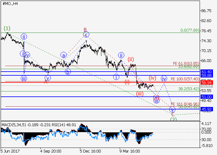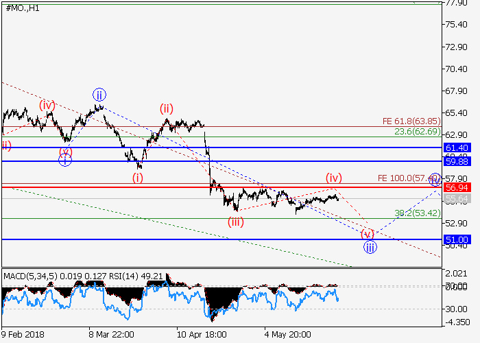 The large downward correction is developing as a wave (2) of the higher level. Locally the third wave of the lower level iii of C of (2) is developing, within which the correctional wave (iv) of iii has ended. If the assumption is correct, the price will fall to the levels of 51.00–45.90. The level of 56.94 is critical and stop loss for this scenario.