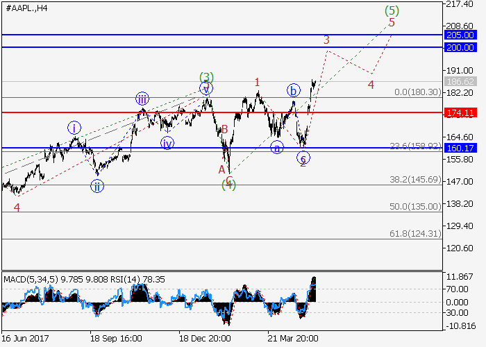 On the 4-hour chart, the fifth wave (5) of the higher level is developing. Now the wave 3 of (5) is developing as a momentum. If the assumption is correct, the price will grow to the area of 200.00–205.00. The level of 174.11 is critical and stop-loss for this scenario.