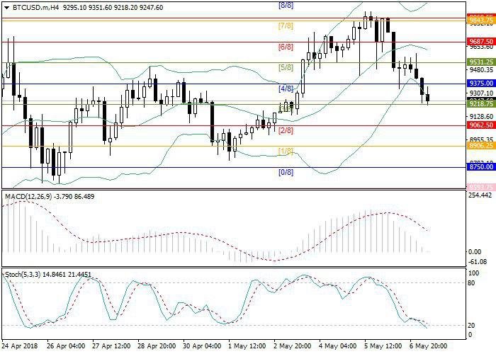 Bitcoin is falling along the lower border of Bollinger Bands. The price is now testing the support level of 9218.75 (Murray [3/8]), the breakout of which will let the sellers decrease the price to the levels of 9062.50 (Murray [2/8])–8906.25 (Murray [1/8]).