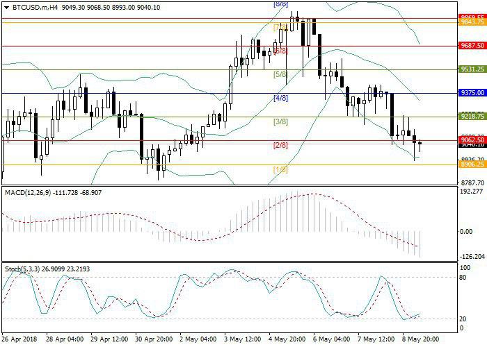 On H4 chart, Bitcoin's quotes are declining along the lower border of Bollinger Bands and approaching the support level of 8906.25 (Murray [1/8]). The breakdown and consolidation of the instrument below this level will open the Bitcoin path to the area of 8750.00 (Murray [0/8]) - 8437.50 (Murray [-2/8]), from which a reversal and formation of an upward trend are possible.