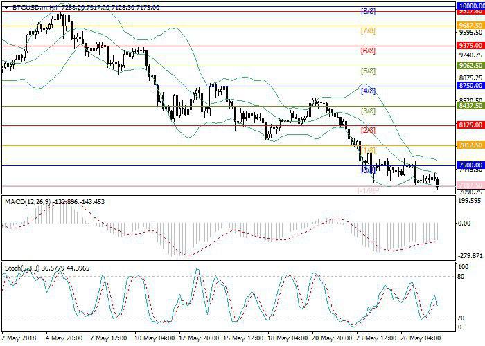 The breakdown and consolidation of the price below the level of 7187.50 will let sellers reach the next strong support level of 6875.00 (Murray [–2/8]), where a reversal and a formation of an upward correction is possible, while its breakdown will lead to a new wave of decrease. Technical indicators reflect the maintenance of the downward movement potential. Bollinger bands are pointed downwards. MACD volumes are growing in the negative zone, forming a sell signal. Stochastic is pointed downwards.