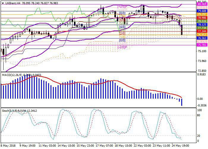 Oil quotes show negative dynamics. The price tested at a minimum at around 77.10 and retains the downward potential to 76.56-75.78 area.