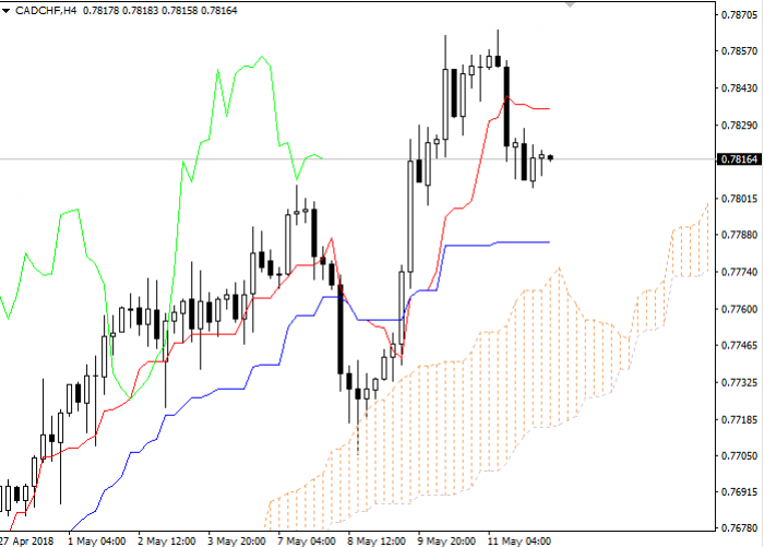 Let's look at the four-hour chart. Tenkan-sen line is above Kijun-sen, the lines are horizontal . Confirmative line Chikou Span is above the price chart, current cloud is ascending. The instrument is trading between Tenkan-sen and Kijun-sen lines. The closest support level is Kijun-sen line (0.7783). The closest resistance level is Kijun-sen line (0.7835).