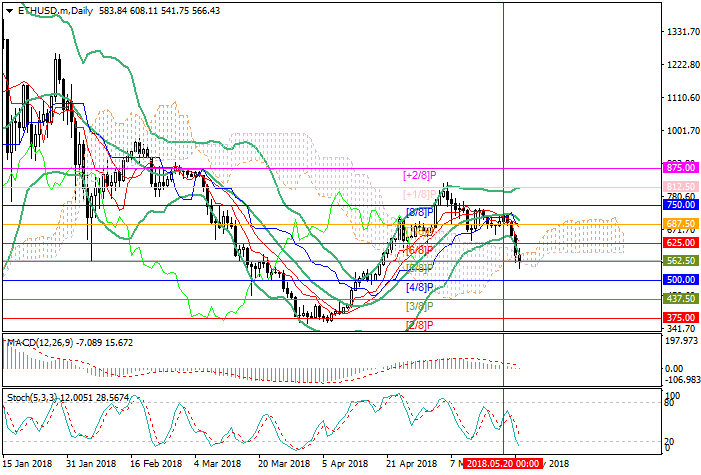 This week, Ether's quotes finally broke down the level of 678.50 (Murray [7/8]) and reached 562.50 mark (Murray [5/8]). Technical indicators point to the continuation of the downward trend. Bollinger Bands diverge, confirming a downward trend. Stochastic is pointing down. MACD histogram is about to move to the negative zone and to form a sell signal.
