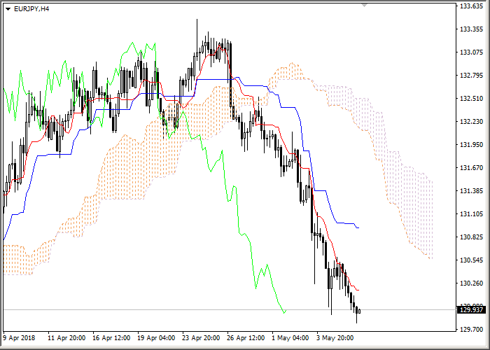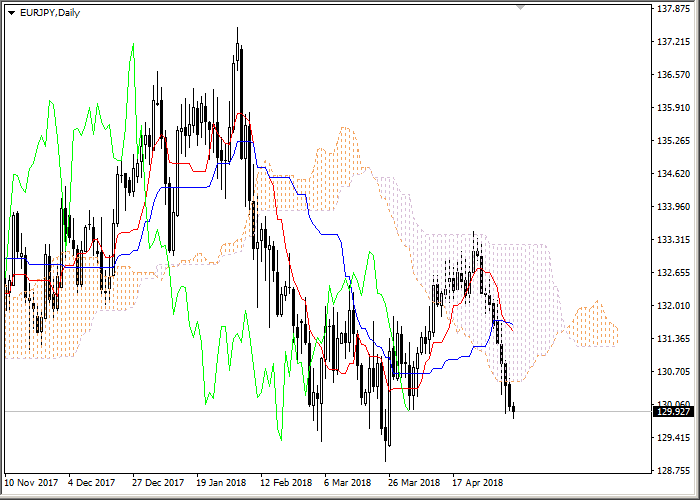 On the both charts the instrument is still falling. It is recommended to open short positions at current price with the target at the level of previous minimum of Chikou Span line (128.90) and Stop Loss at the lower border of the cloud (130.53).