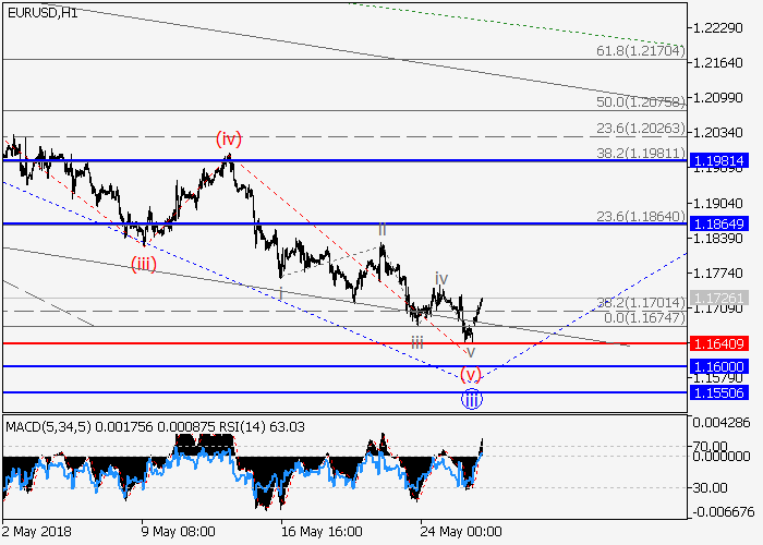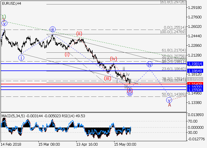 On the 4-hour chart, the downward momentum of the higher level is forming as a wave A of (2). Now the third wave of the lower level iii of А is developing, and the development of a correctional growth of the pair within the fourth wave iv of A begins. If the assumption is correct, the pair will grow to the levels of 1.1864–1.1980. The level of 1.1640 is critical and stop-loss for this scenario.