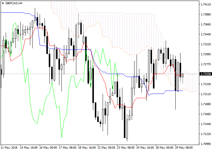 On the daily chart Tenkan-sen line is below Kijun-sen, the lines are horizontal . Confirmative line Chikou Span is below the price chart, current cloud is descending. The instrument has been corrected to the Tenkan-sen line. One of the previous minimums of Chikou Span line is expected to be a support level (1.7115). The closest resistance level is Kijun-sen line (1.7540).