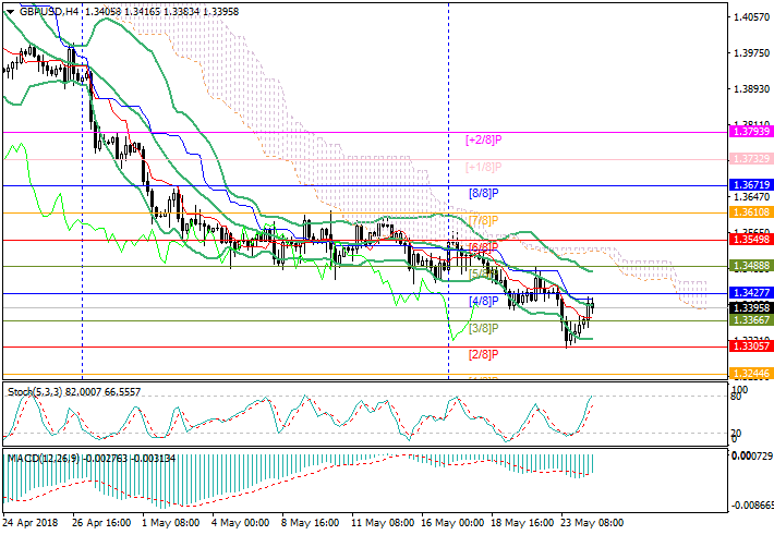The key “bullish” level is 1.3427 (Murray [2/8], middle line of Bollinger bands). The breakout will let the price grow to 1.3488 (Murray [5/6]) and 1.3550 (Murray [6/8]). Otherwise, the price can return to 1.3305 (Murray [2/8]) and fall to 1.3244 (Murray [1/8]). Technical indicators reflect the increase. Stochastic is directed upwards, MACD decreases in the negative zone.