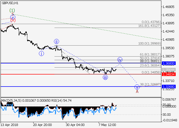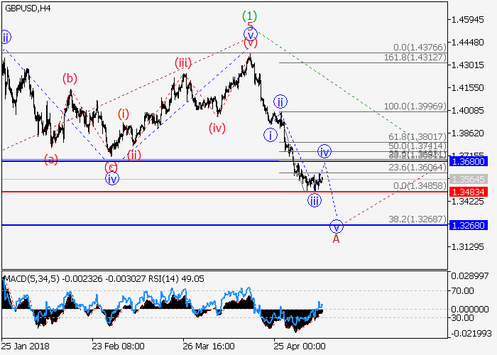 On the 4-hour chart, the downward correction of the higher level is developing as a wave (2). Locally the wave А of (2) is forming, within which the correction fourth wave of the lower level iv of A is developing. If the assumption is correct, the pair will grow to the level of 1.3680. The level of 1.3483 is critical and stop-loss for this scenario.