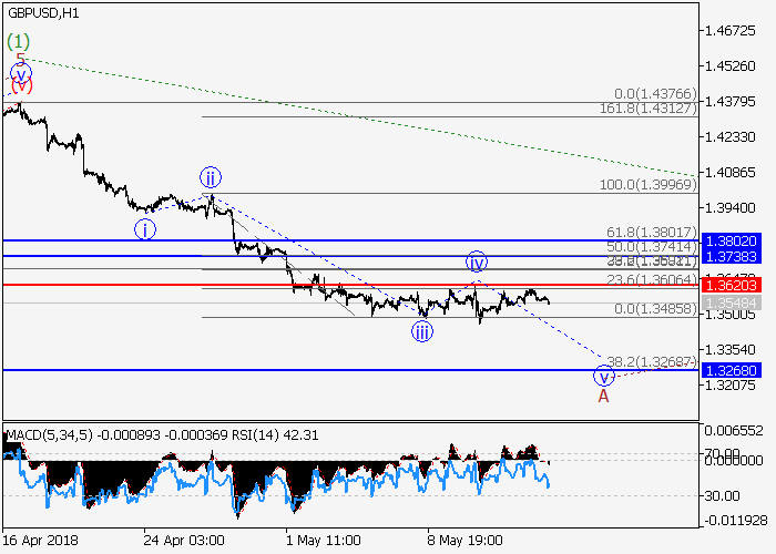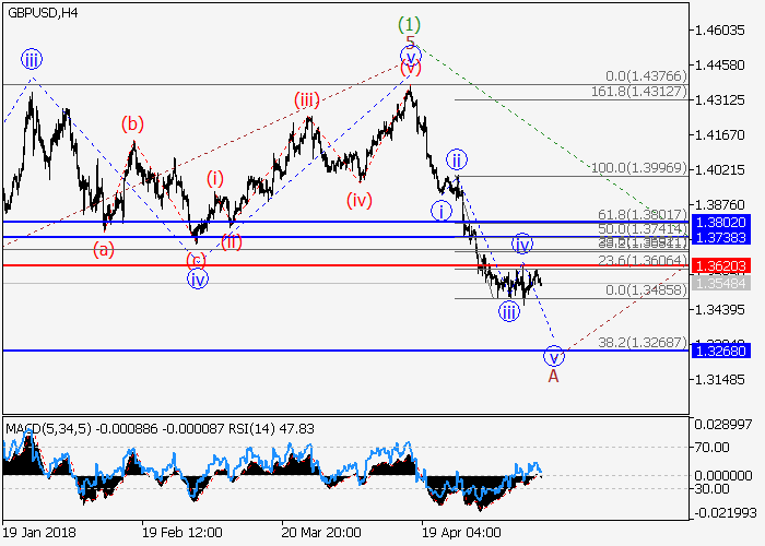 On the 4-hour chart, the downward correction of the higher level is developing as a wave (2). Locally the wave and of (2) is forming, within which the fourth correctional wave of the lower level iv of A has formed, and the wave v of A is developing. If the assumption is correct, the pair will fall to the level of 1.3268. The level of 1.3620 is critical and stop-loss for this scenario.