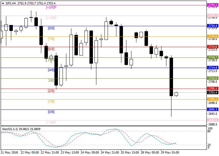 S&P500 broad spectrum index is declining with the opening of the European session. At the moment, the rate is 2701.2, the nearest important support level, from which a turn is possible, is located at 2695.3 or 0/8 Murray.