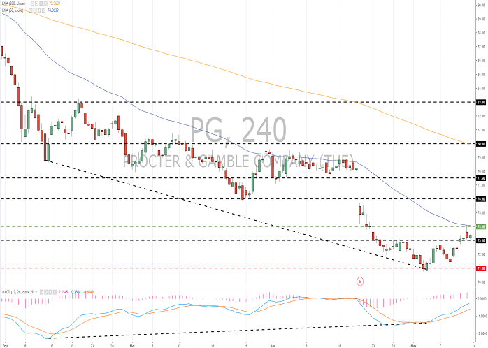 The current technical picture indicates a possible correction of the company's shares. There is a classic reversal formation in the issuer — divergence of price and MACD indicator, for quite a long time. Currently the quotes of #PG are testing the "mirror" support level of 73.00. The local resistance level is 74.00. MACD histogram is in the positive zone and continues to rise, which signals the strength of the buyers. In the near future it is advisable to consider purchase of #PG.