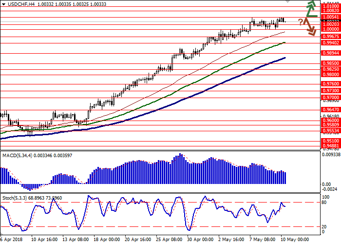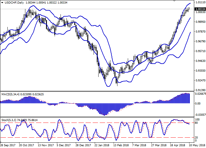 USD is growing against CHF and renewing highs since May 2017, supported by the growth of 10-years treasury bonds’ yield, while the franc is reacting negatively to the development of the political crisis in Italy.