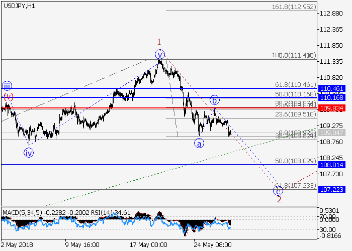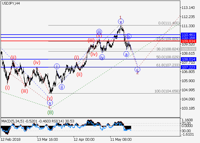 On the 4-hour chart, the upward momentum has formed as a first wave 1 of (C) of the higher level. Now the downward correction is developing as a wave 2 of (C), within which the price will fall to the level of 108.01. The level of 109.83 is critical and stop loss for this scenario.