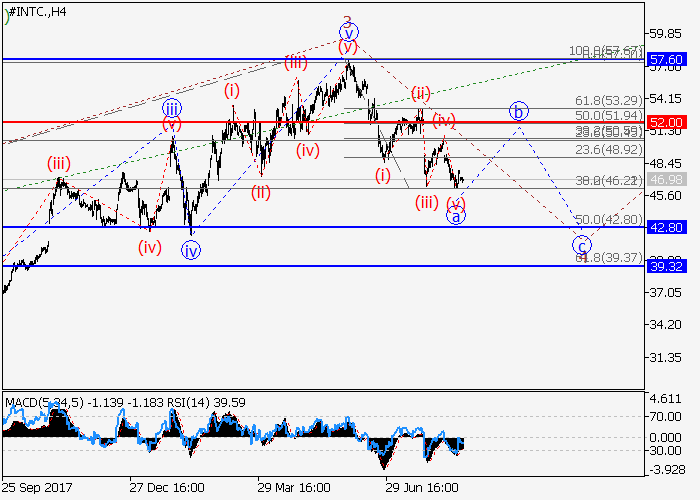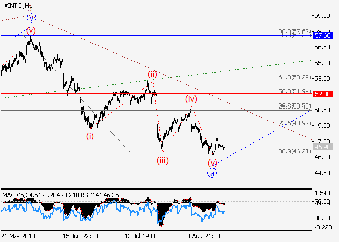 On the 4-hour chart, the downward correction develops as a fourth wave 4 of the higher level. Locally the wave a of 4 as has formed a wedge, and the correctional growth of the price within the wave b of 4 begins. If the assumption is correct, after the end of the correction the price will fall to the level of 42.80. The level of 52.00 is critical and stop loss for this scenario.