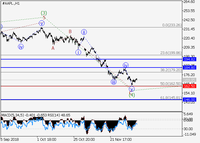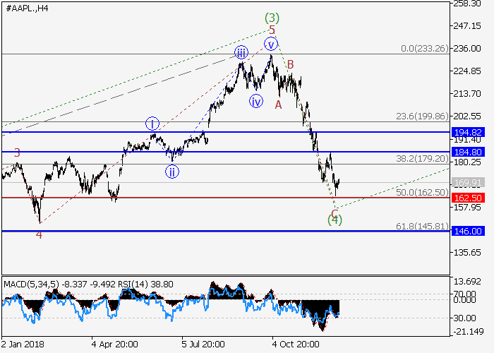 On the H4 chart the downward correction as a wave (4) has taken the form of a zigzag with an elongated wave C of 4. At the moment, the fifth wave of the lower level v of C has been completed. The growth of price may continue to the levels of 184.80–194.82. The critical level for this scenario is 162.50.