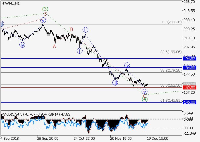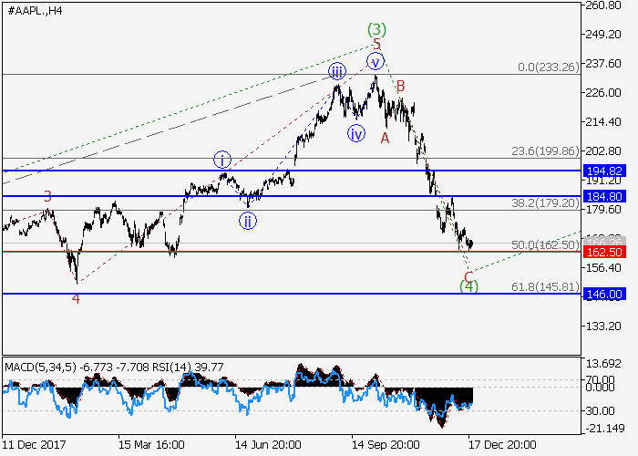 On the 4-hour chart, the downward correction formed as a wave (4), shaped as a zigzag with a lengthened wave C of 4. Now the fifth wave of the lower level v of C is ending. If the assumption is correct, the price will grow to the levels of 184.80–194.82. In this scenario, critical stop loss level is 162.50.
