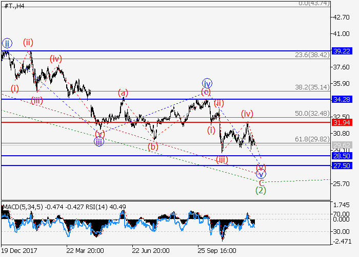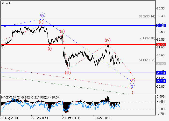 On the 4-hour chart, the downward correction of the senior level as a wave (2) continues. At the moment, it seems that the formation of the wave C of (2) is nearing completion, within which the fifth wave of the junior level v of C is developing. If the assumption is correct, the asset price will continue to decline to 28.50–27.50. The critical level for this scenario is 31.94.