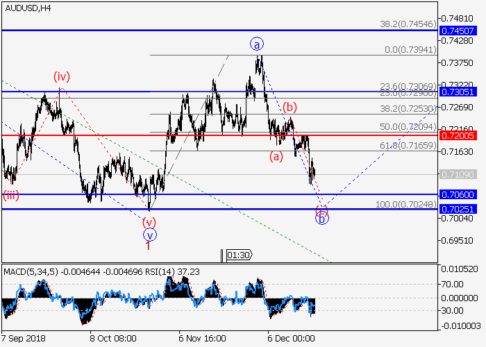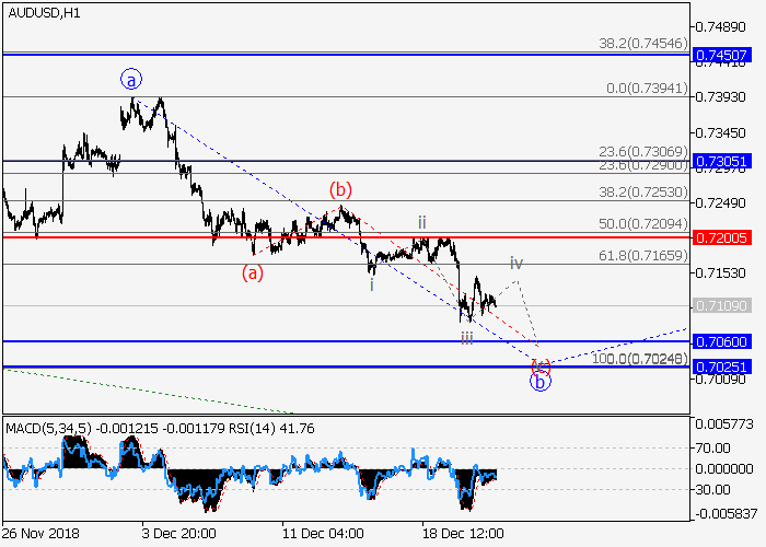 On the 4-hour chart, an upward correction develops as the wave 2 of (5). Now, the wave b of 2 is developing as a zigzag, within which the wave (c) of b is developing. If the assumption is correct, the pair will fall to the levels of 0.7060–0.7025. In this scenario, critical stop loss level is 0.7200.