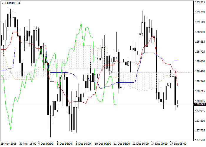 Let's look at the four-hour chart. Tenkan-sen line is below Kijun-sen, the red line is directed downwards, while the blue one remains horizontal. Confirmative line Chikou Span is below the price chart, current cloud is ascending. The instrument has broken down the cloud and slowed down its fall. One of the previous minimums of Chikou Span line is expected to be a support level (127.70). The closest resistance level is Tenkan-sen line (128.30).