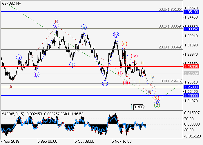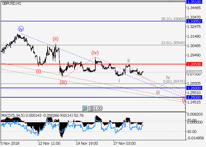 On the 4-hour chart, the downward correction of the higher level develops as a wave 2. Now the wave C of 2 is developing, within which the fifth wave of the lower level v of C is forming. If the assumption is correct, the pair will fall to the level of 1.2600. In this scenario, critical stop loss level is 1.2850.