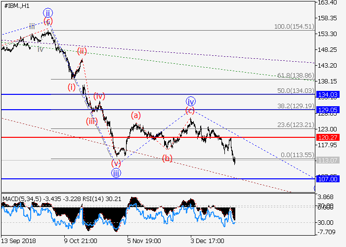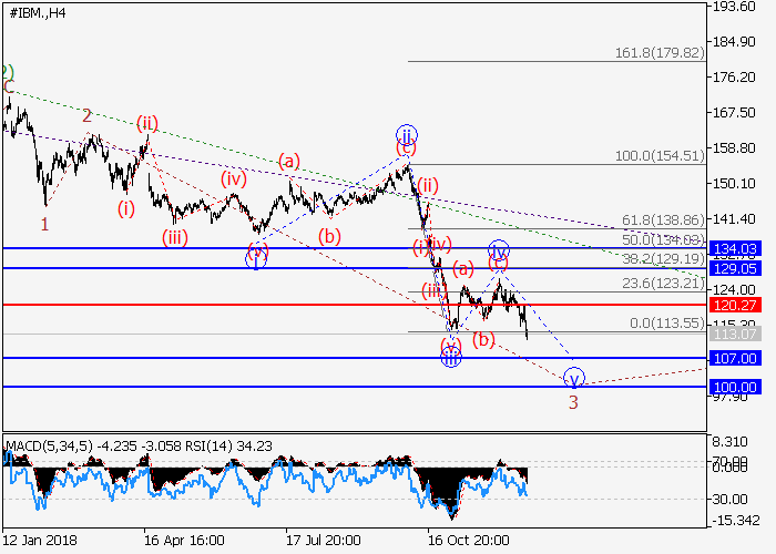 On the 4-hour chart, a downward trend develops as the third wave of the higher level 3. Now the upward correction iv of 3 has formed, and the fifth wave of the lower level v of 3 is developing. If the assumption is correct, the price will fall to the levels of 107.00–100.00. In this scenario, critical stop loss level is 120.27.