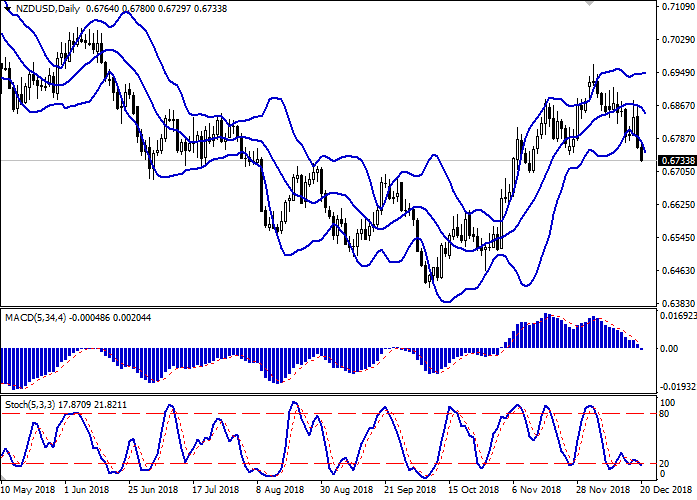 On the daily chart, Bollinger bands reverse horizontally. The price range is widening but not as fast as the "bearish" dynamics is now developing. MACD indicator is falling, keeping a strong sell signal (the histogram is below the signal line), and is trying to consolidate below the zero line. Stochastic is directed downward but it is near its low, which indicates that NZD can become oversold.