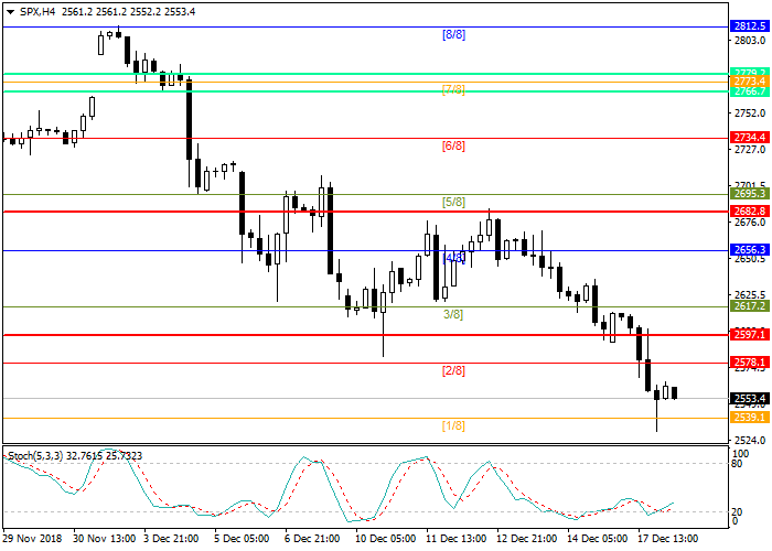 S&P 500 continues declining. The closest support level is at 2539.1 (Murrey [1/8]).