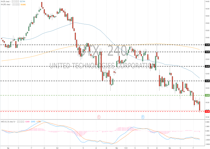 Yesterday, United Technologies shares renewed the 52-week low, losing more than 7% since early December. Quotes still remain under pressure amid general market declines and corporate news about the company's division. In addition, as a result of the restructuring of the business and the integration of Rockwell Collins into the company's assets, the annual earnings per share and free cash flow projections were reduced to $7.10–7.20 and $4.25–4.5 billion, respectively.