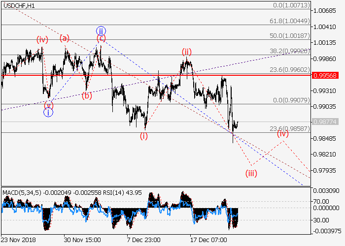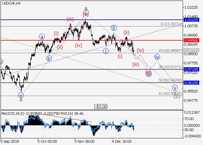 On the 4-hour chart, a downward correction of the higher level develops as the wave (2), within which the wave C of (2) forms. Now, the third wave iii of C is forming, within which the wave of the lower level (iii) of iii is developing. If the assumption is correct, the pair will fall to the levels of 0.9724–0.9618. In this scenario, critical stop loss level is 0.9956.