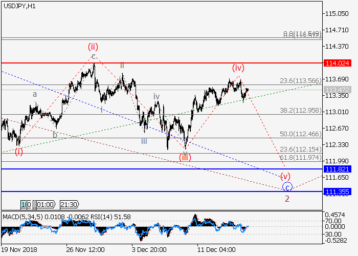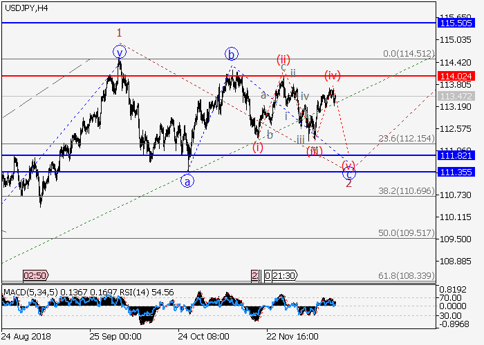 On the H4 chart, the local downward correction of the senior level continues as a wave 2 of (C). At the moment, it is likely that a wave of c of 2 is being formed, within which the correctional wave of the junior level (iv) of c was completed. If the assumption is true, the pair will continue to decline to the levels of 111.82–111.35 within the framework of wave (v) of c. The critical level for this scenario is 114.02.