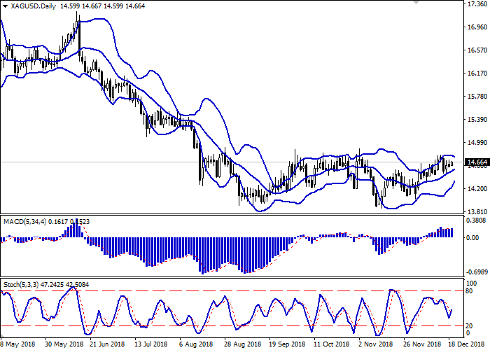 Bollinger Bands in D1 chart show moderate growth. The price range is narrowing, reflecting the ambiguous nature of trading of recent days. MACD is growing, keeping a weak buy signal (located above the signal line). Stochastic reversed upwards again after an active decline at the end of last week.