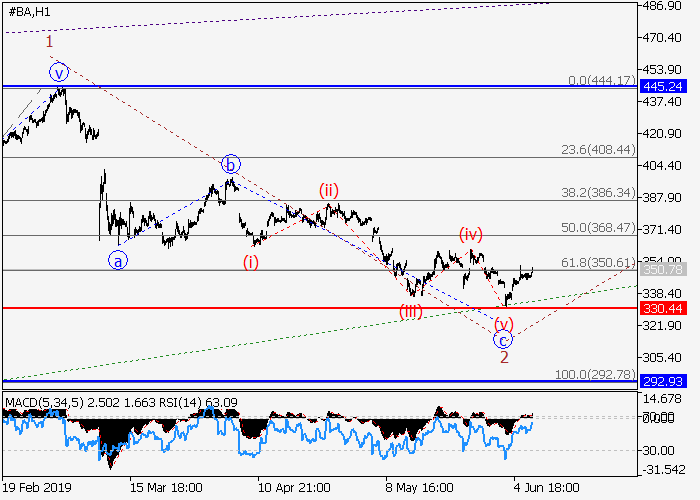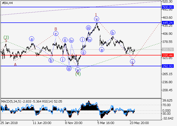 On the 4-hour chart, the fifth wave of the higher level (5) develops, within which the wave 1 of (5) formed, and the downward correction 2 of (5) has developed. Now, the wave c of 2 has formed as a momentum. If the assumption is correct, the price will grow to the levels of 445.24–500.00. In this scenario, critical stop loss level is 330.44.