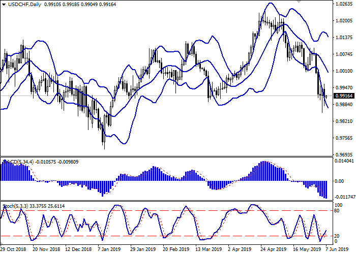 On the daily chart, Bollinger bands fall. The price range expands from below, indicating a strong downward momentum in the short term. The MACD falls, keeping a sell signal (the histogram is below the signal line). Stochastic, responding to the appearance of upward dynamics in the middle of the week, reversed upwards, indicating that USD is oversold in the super short term.