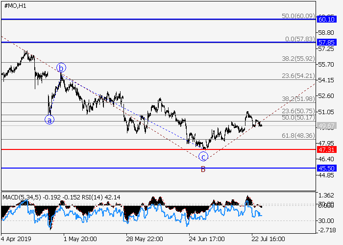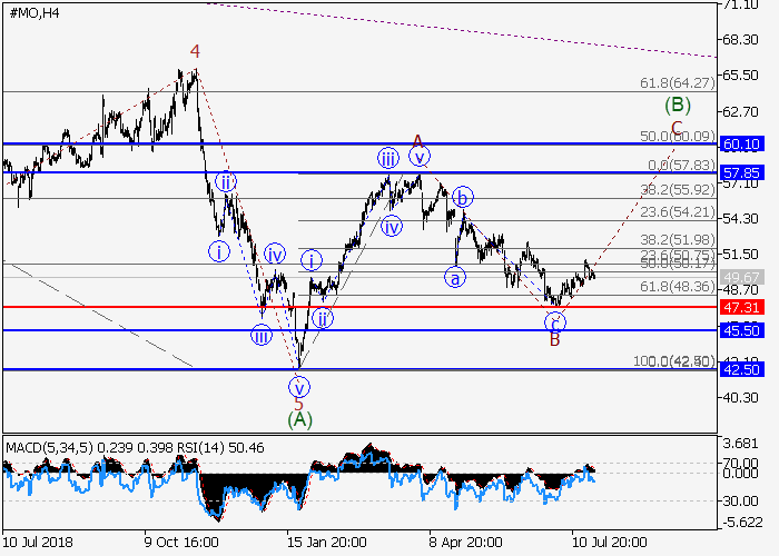 On the 4-hour chart, the upward correction of the higher level develops as the wave (B) of 2. Now, the wave B of (B) has developed, and the development of the wave C of (B) is beginning, within which the first wave of the lower level is forming. If the assumption is correct, the price will grow to the levels of 57.85–60.10. In this scenario, critical stop loss level is 47.31.