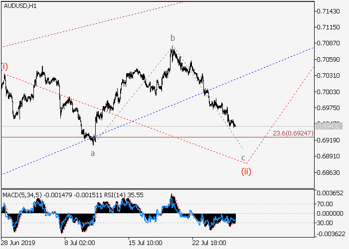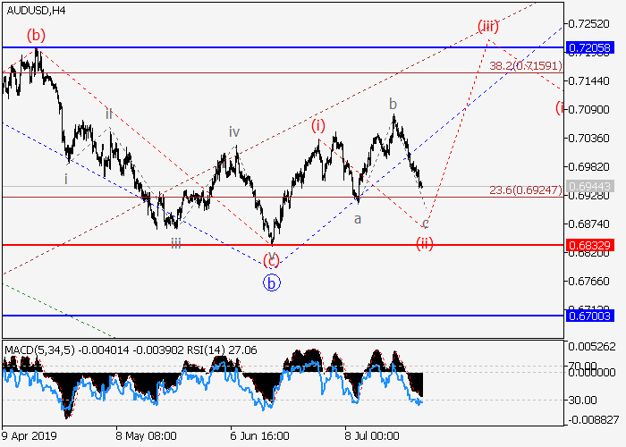 On the 4-hour chart, the correction of the higher level develops as the second wave 2 of (5), within which the formation of the wave c of 2 began. Now, the first wave of the lower level (i) of c has formed, and the downward correction (ii) of c is developing as an irregular flat. If the assumption is correct, after the end of the correction, the pair will grow to the levels of 0.7205–0.7293. In this scenario, critical stop loss level is 0.6832.