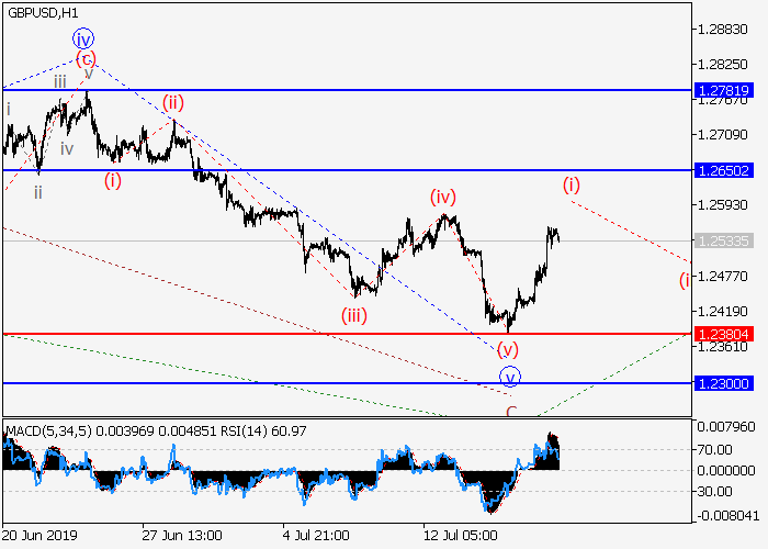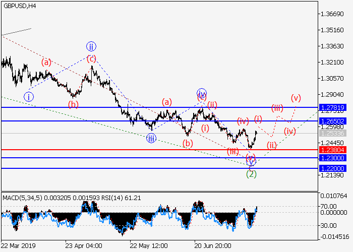 On the 4-hour chart, the downward correction of the higher level developed as the wave (2), within which the wave C of (2) formed as a momentum. Now, the development of the third wave (3) is beginning, within which the first wave of the lower level (i) of i of 1 of (3) is forming. If the assumption is correct, the pair will grow to the levels of 1.2650–1.2780. In this scenario, critical stop loss level is 1.2380.