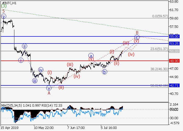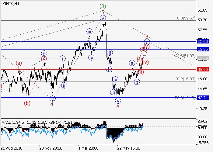 On the 4-hour chart, the third wave (3) of the higher level developed, and a downward correction forms as the wave (4). Now, the downward momentum has formed within the wave A of (4), and the upward local correction of the lower level B of (4) is developing, within which the wave c of B is forming. If the assumption is correct, the price will grow to the levels of 53.25–55.00. In this scenario, critical stop loss level is 48.90.