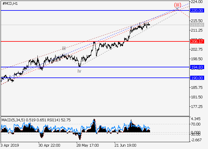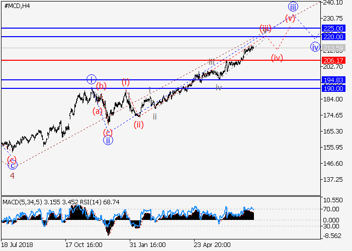 On the 4-hour chart, the fifth wave of the higher level 5 of (3) develops, within which the third wave iii of 5 of (3) forms. Now, the third wave of the lower level (iii) of iii is developing, within which the wave v of (iii) is forming. If the assumption is correct, the price will grow to the levels of 220.00–225.00. In this scenario, critical stop loss level is 206.17.