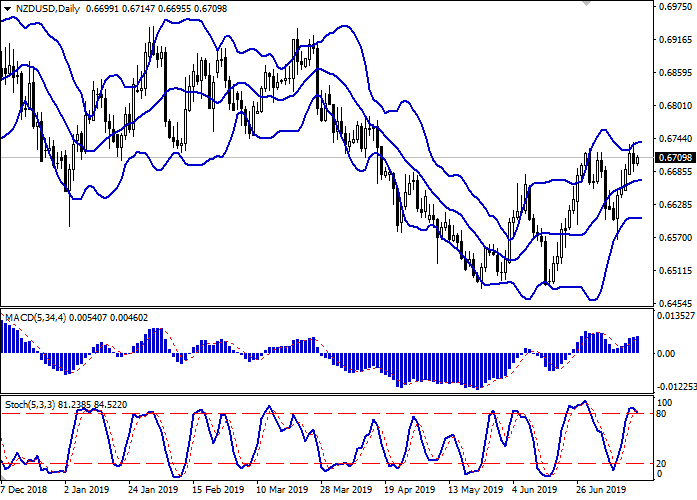 On the daily chart, Bollinger bands reverse horizontally. The price range tries to consolidate, reflecting the ambiguous dynamics in the super-short term. The MACD grows, keeping a moderate buy signal (the histogram is above the signal line). Stochastic, approaching its highs, is prone to reverse downwards, reflecting that NZD is overbought in the super short term.
