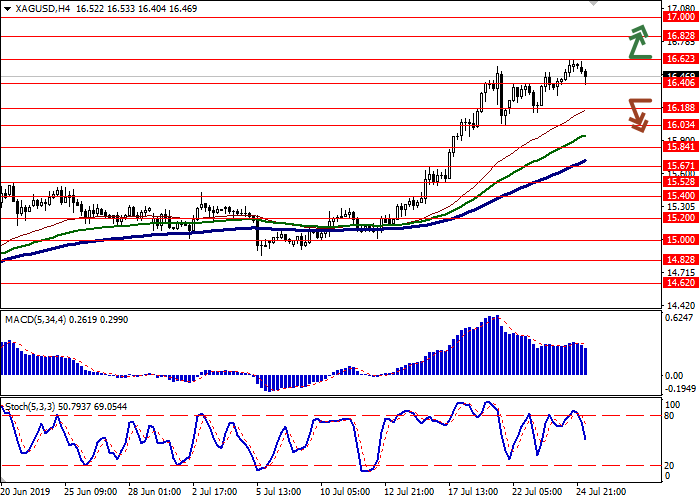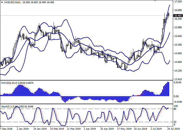 Yesterday, silver prices rose markedly, renewing record highs since June 15, 2018, due to the market expectations of a new cycle of monetary policy easing by the world's leading central banks. The ECB meeting will take place today, and the FED meeting will be held July 30–31. Unlike the Fed, the European regulator is not expected to reduce the rate at the June meeting but the officials’ comments and the general mood of the bank will be important. The ECB has repeatedly spoken in favor of new easing for the economy, so there is no reason to believe that this time the rhetoric will differ. Silver is also supported by poor US macroeconomic statistics. Yesterday, investors were disappointed by data on business activity, which did not reach the forecasts of analysts.